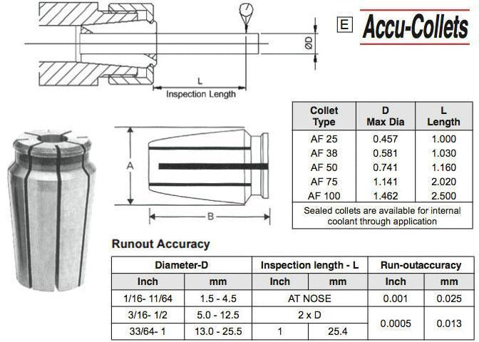 - Collet sizes .172 thru 2.000 are guaranteed to .0005 T.I.R. at 2 times the tool diameter, or a maximum one inch from the face of the collet