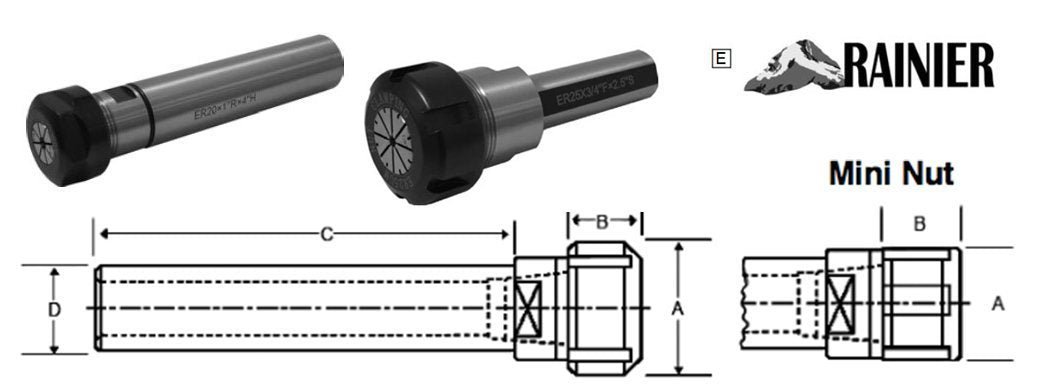| Collet Series | Shank Dia D | Shank Length C | Nut Dia A | Nut Length B | Nut Type | Shank Type | Part Number | Thread of Nut | Collet Nut Part Number | Wrench Part Number |