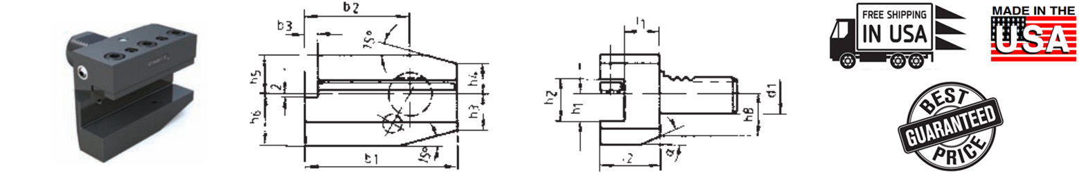 | d1 | b1 | b2 | b3 | h1 in | h1 mm | h2 | h3 | h4 | h5 | h6 | h8 | L1 | L2 | α | Part Number |