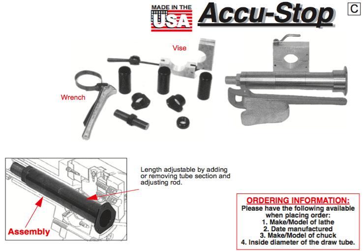 The Accu-Stop Assembly is constructed of low carbon steel coated with zinc oxide for lasting strength and durability. The faceplate of the assembly mounts to the front of a draw tube style manual or power chuck, while the extension tubes extend back into the draw tube to accommodate work pieces of any length. The Accu-Stop bolts to the front of the chuck, allowing your work piece and the stop to turn together, eliminating friction damage. Easily pays for itself in just a few jobs by eliminating the time it takes to use the turret to locate your work piece!