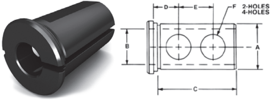 This bushing with clearance holes and split milled flat can be used as a conventional “B” style or “J” style bushing.